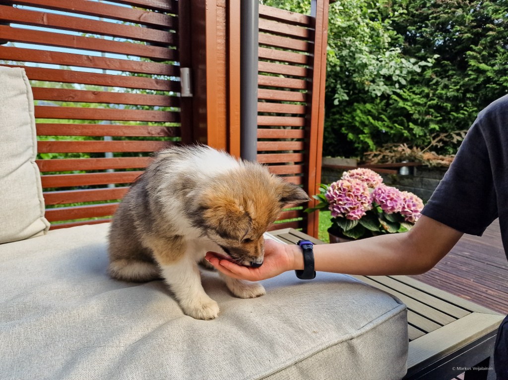 On kulunut pari viikkoa siitä kun Unni saapui meille. Aika kuluu nopeasti ja paljon on ehtinyt tapahtua. Hoitotoimenpiteiden harjoittelu on aloitettu tassujen, korvien ja hampaiden tutkimisella. Pointtina on koskea rauhallisesti erityisesti tassujen ja korvien alueella, jotta Unni tottuu siihen. Hampaiden seutu onkin sitten lähes päivittäisen ”tutkinnan” alla kun Unni testaa purukalustoa erilaisiin luvallisiin ja luvattomiin paikkoihin. Olen yhdistellyt hampaiden tutkimisen toisinaan samaan yhteyteen, kun olen ottanut Unnin suusta pois kielletyn esineen. Pennun toimintaan kuuluvaa näykkimistä Unnilla on varsinkin väsyvillien aikaan. Nämä perinteiset, ennen unia otettavat, villit kestävät toisinaan yllättävänkin kauan ja niihin liittyy välillä hyökkäilyä ihmisten jalkoihin, johon tietysti puututaan.